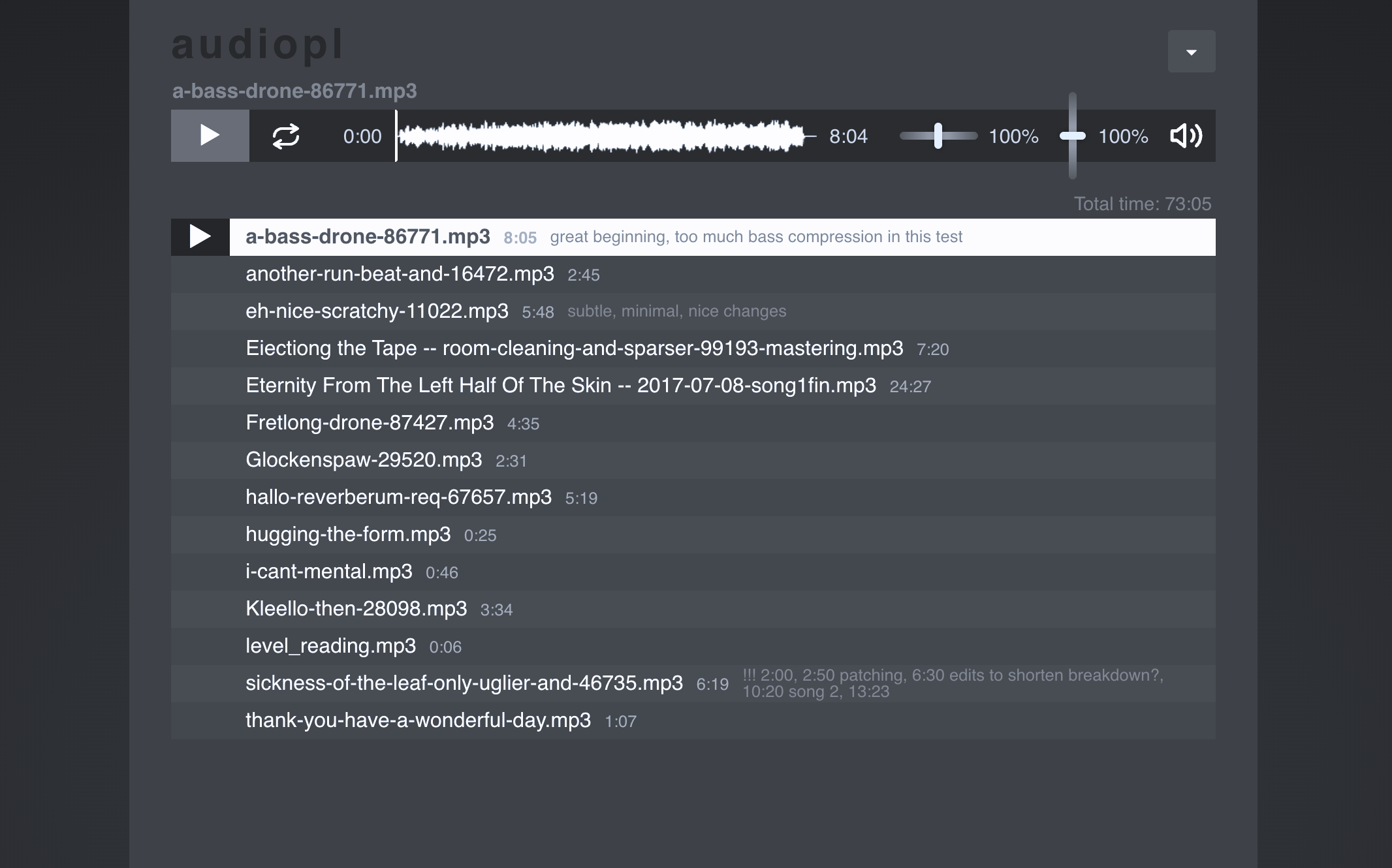 This is an audio playlist player with track notes, looping, normalization and pitch control. I use it for managing recordings and taking notes during the recording and mastering process. There are no servers involved, all files are used/processed locally only. You can install this as an app on your desktop.